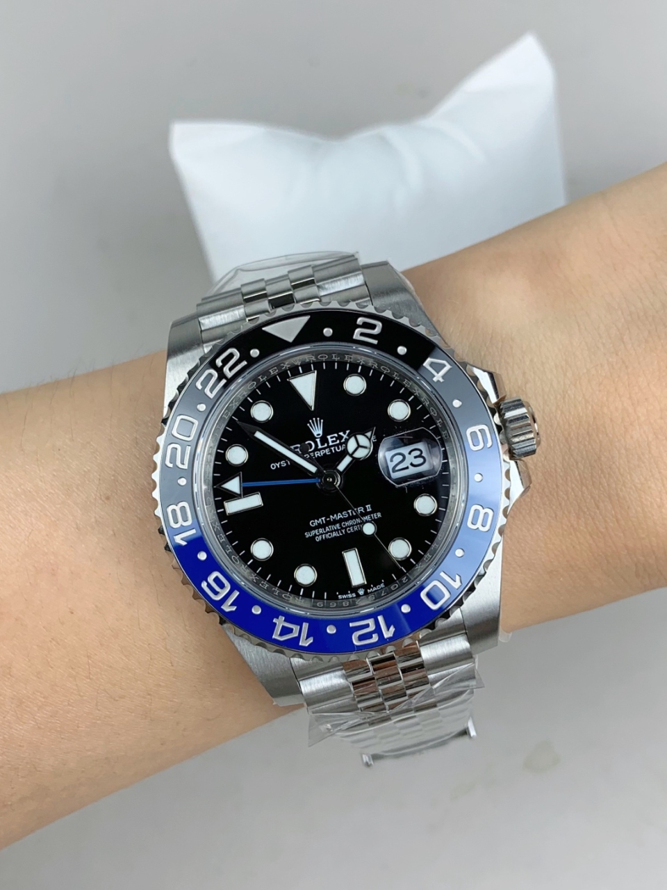 | Movement | Asian JingHe Super Clone 3285 Automatic GMT movement with decorated bridges & rotor with correct hand stack, Free Sprung same as geunine. |